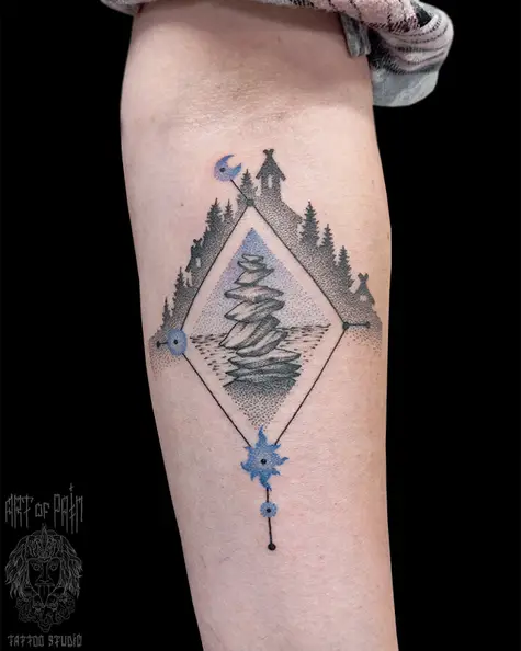 Татуировка женская графика на предплечье лес и камни (Николай Орф) 8308