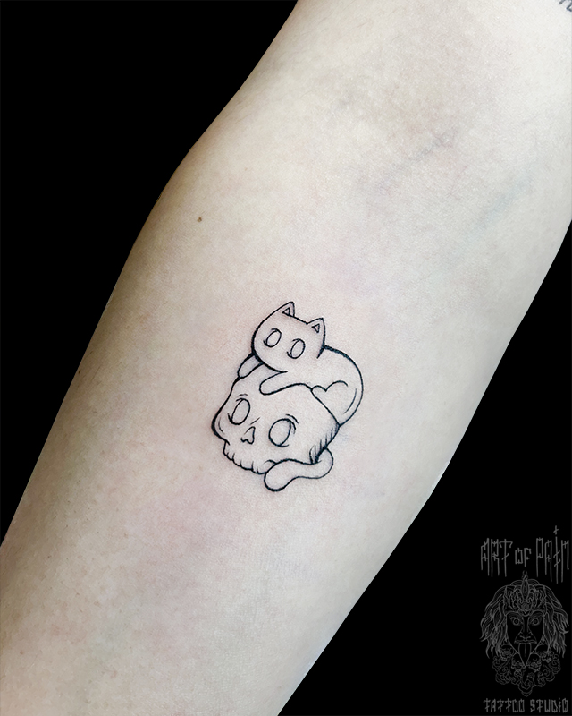 Татуировка женская графика на предплечье череп и котик 8344