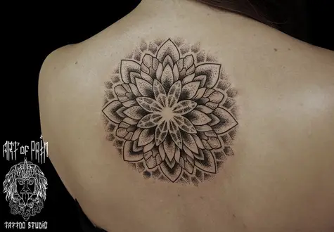 Татуировка женская графика на спине мандала 835