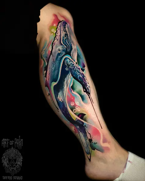 Татуировка женская цветной реализм на голени кит (Дмитрий Шейб) 8352