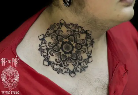 Татуировка женская графика на шее мандала 836