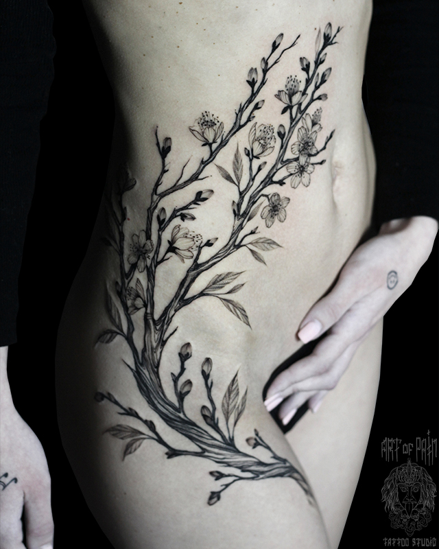 Татуировка женская графика на бедре сакура (Надежда Полякова) 8378