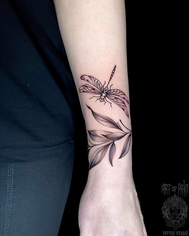Татуировка женская графика на запястье стрекоза (Евгения Шмидт) 8389