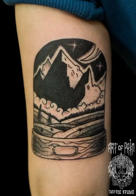 Татуировка женская графика на бедре пейзаж 850