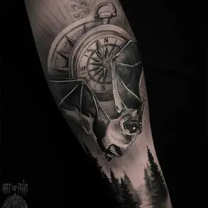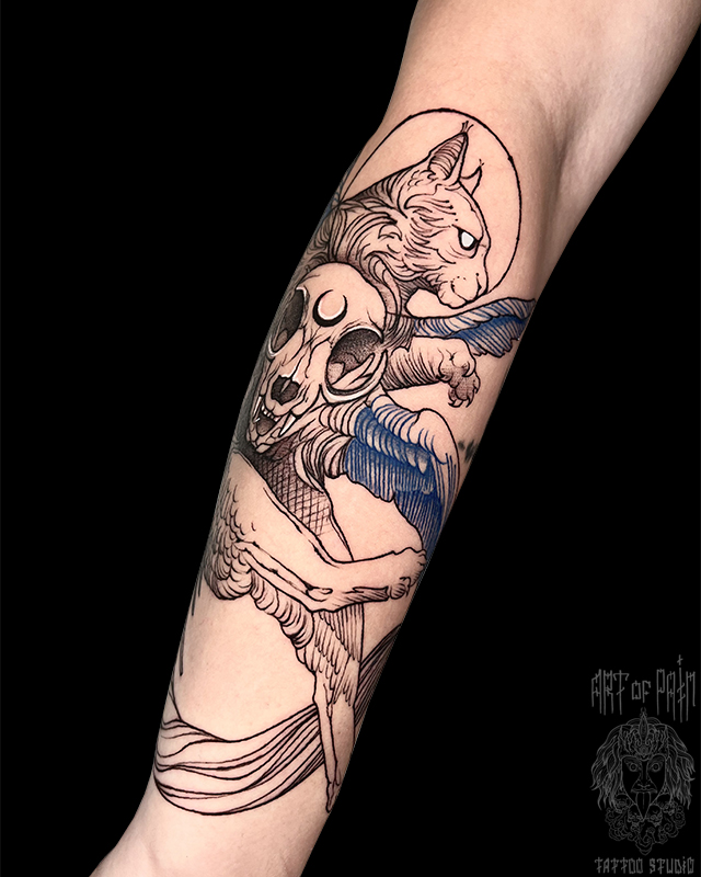 Татуировка женская графика на предплечье кот и череп (Евгения Шмидт) 8522