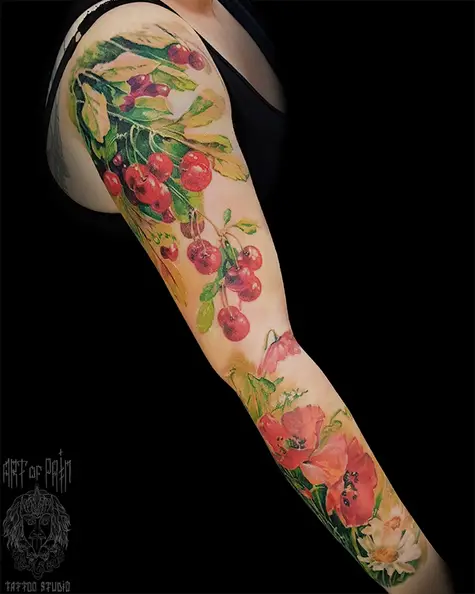 Татуировка женская цветной реализм тату-рукав вишни, маки, ромашки 8541