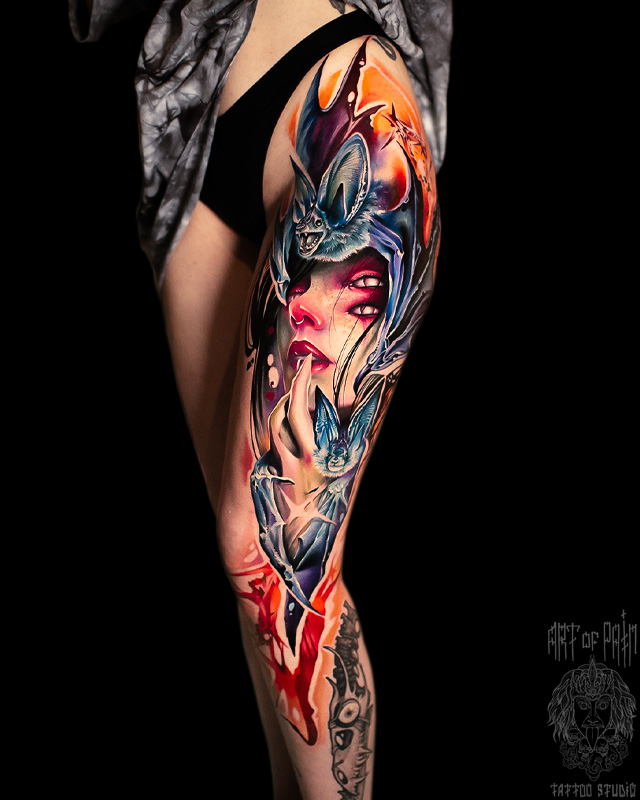 Татуировка женская цветной реализм на ноге девушка и летучие мыши (Дмитрий Шейб) 8600