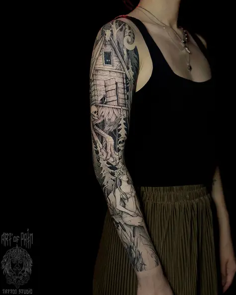Татуировка женская графика тату-рукав избушка на курьих ножках, девушки, черепа (Мария Котова) 8664