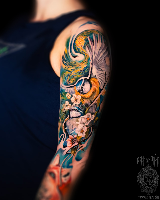 Татуировка женская цветной реализм тату-рукав синицы (Дмитрий Шейб) 8697