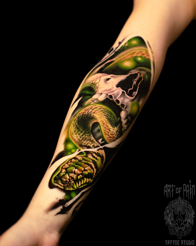 Татуировка женская цветной реализм на предплечье череп и змея (Дмитрий Шейб) 8698