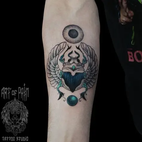 Татуировка женская графика на предплечье скарабей 876