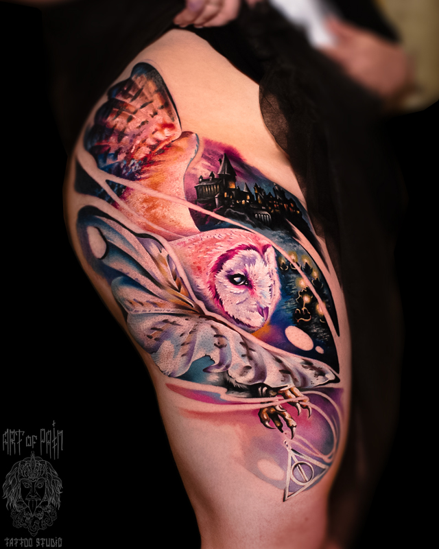Татуировка женская цветной реализм на бедре сова (Дмитрий Шейб) 8773
