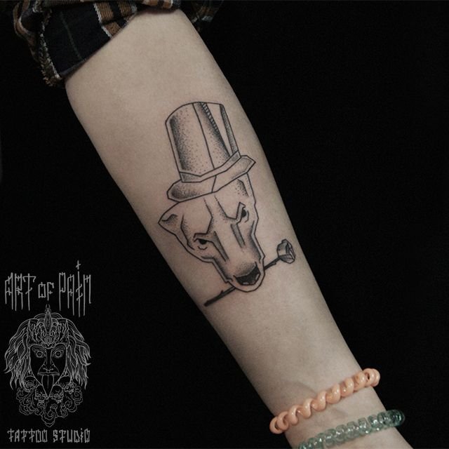 Татуировка женская графика на предплечье собака в цилиндре 880