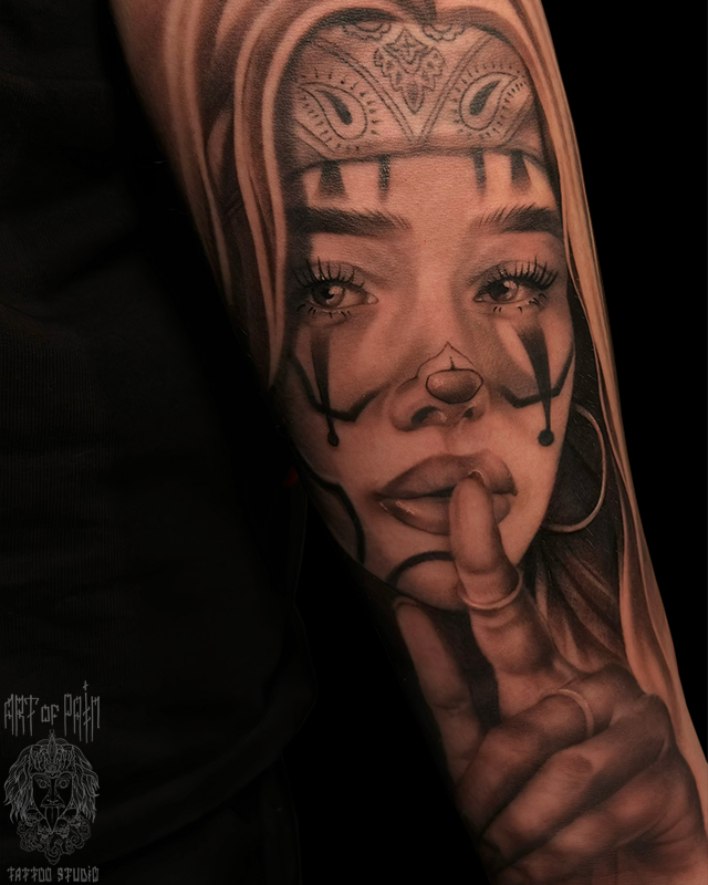 Татуировка женская чикано на предплечье девушка в бандане 8819