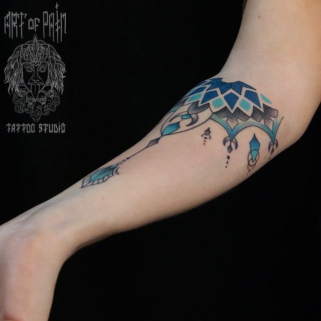 Татуировка женская графика на предплечье цветной узор 891