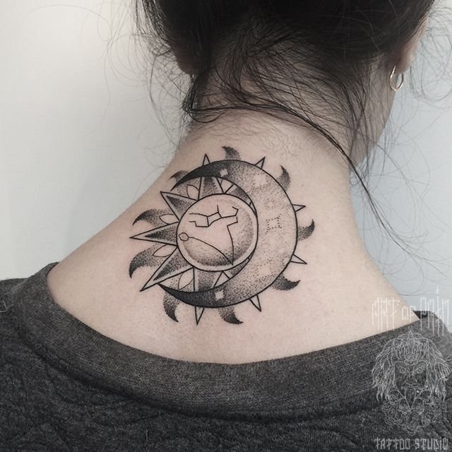 Татуировка женская графика на шее луна и солнце 893