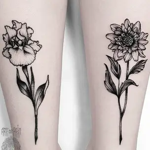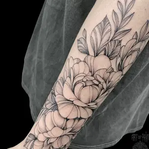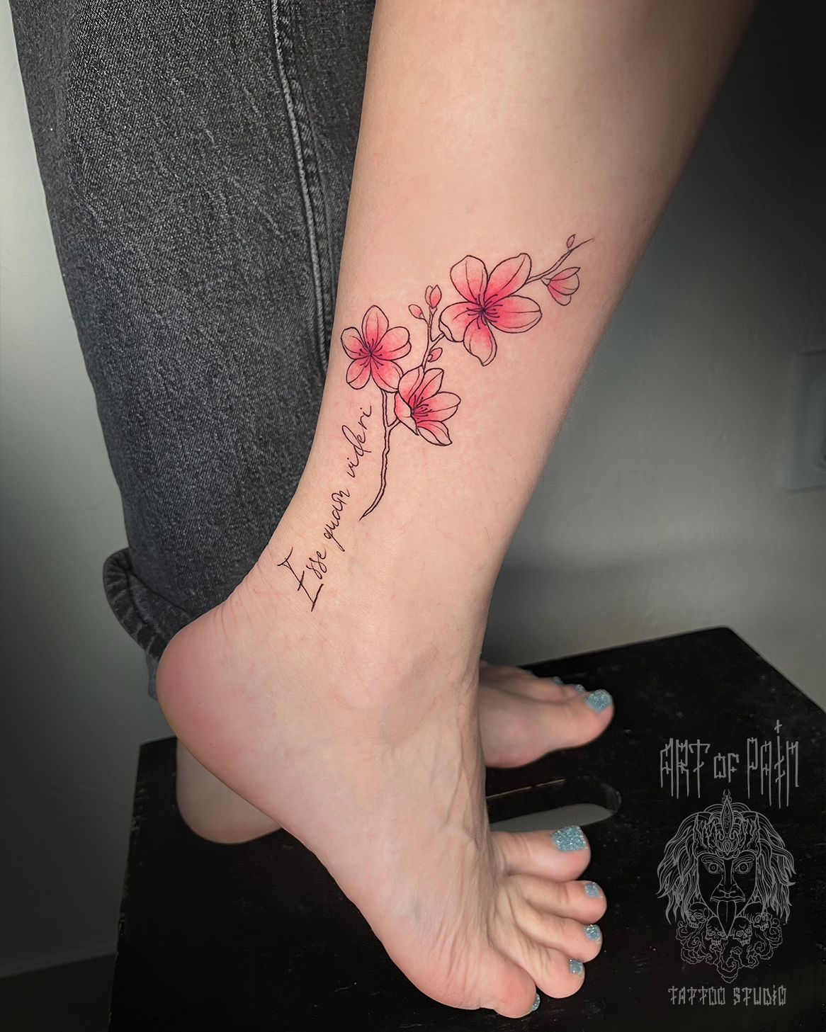 Татуировка женская флористика на голени сакура и надпись (Евгения Шмидт) 8946