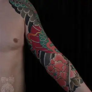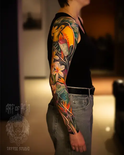 Татуировка женская цветной реализм рукав тукан и хамелеон (Дмитрий Шейб) 8955