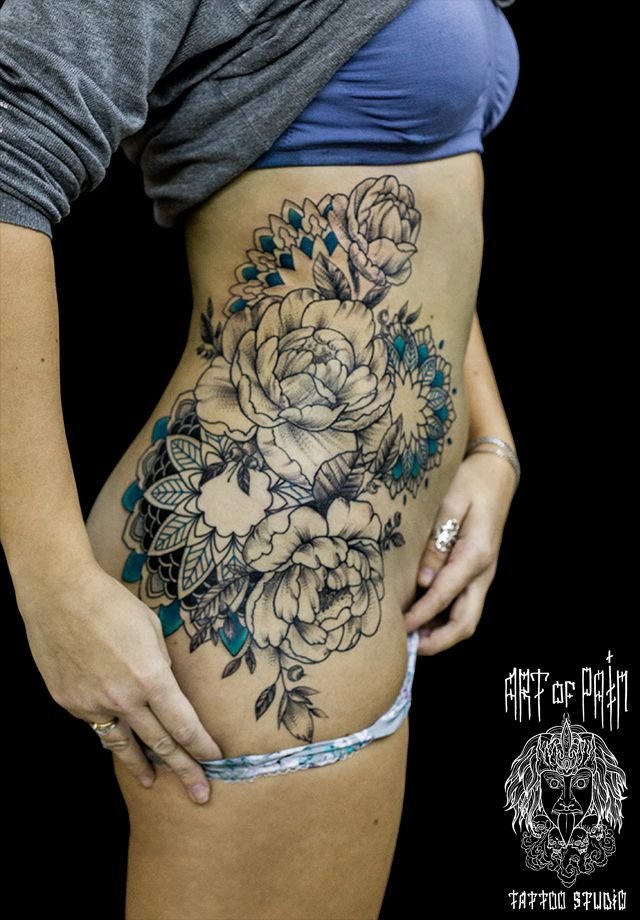 Татуировка женская графика на боку пионы и мандалы 895