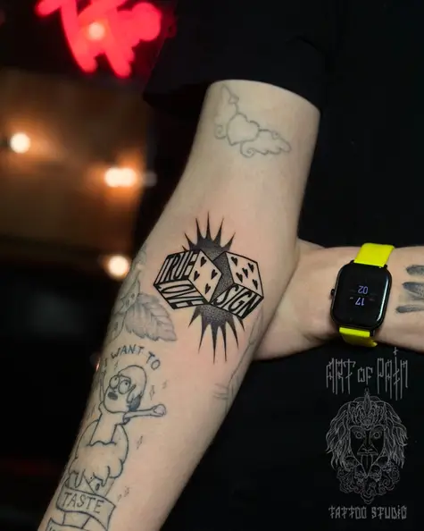 Татуировка женская графика на руке игральные кости и надпись (Елизавета Пилипенко ) 8963