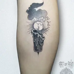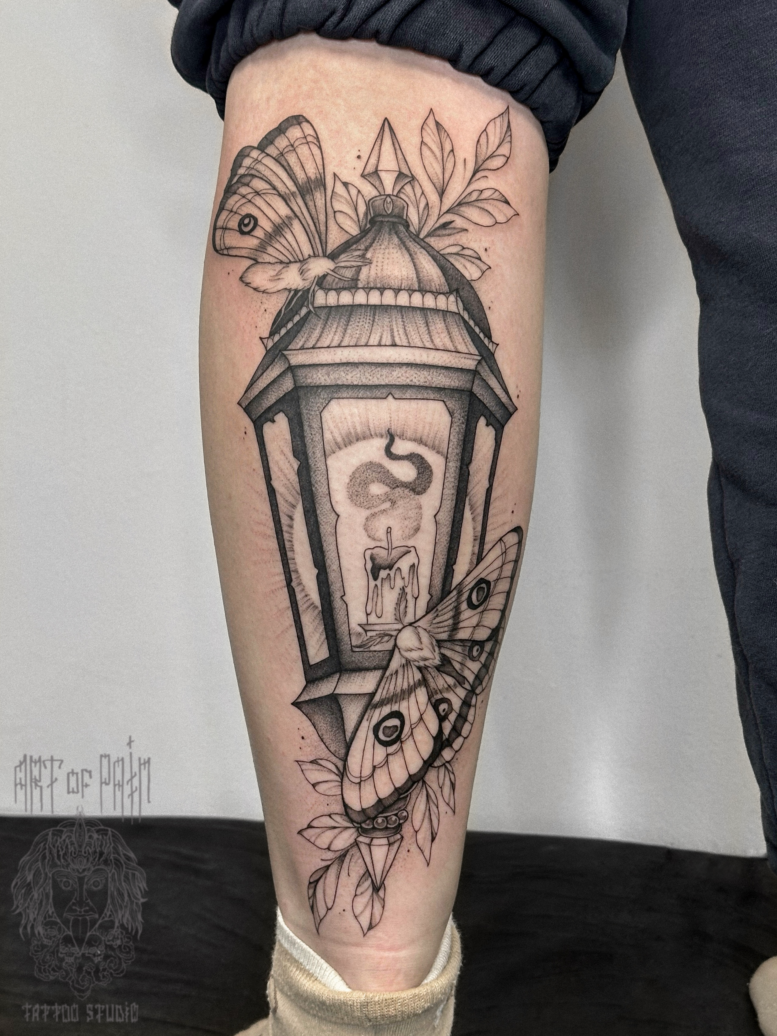 Татуировка женская графика на икре фонарь и мотыльки (Мария Котова) 9014