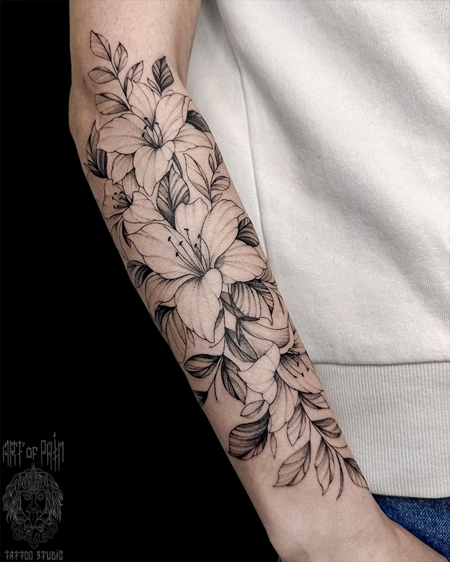 Татуировка женская графика на предплечье цветы (Мария Котова) 8654