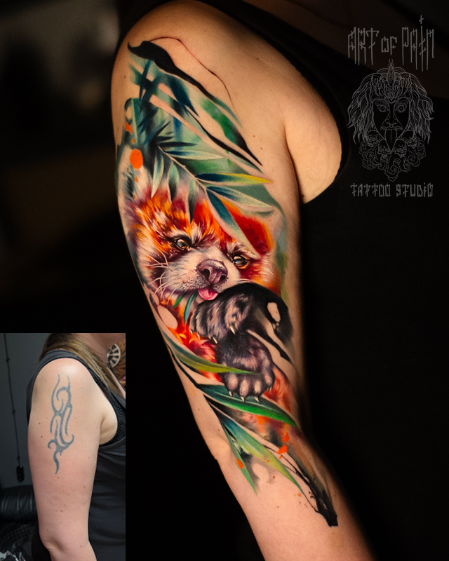 Татуировка женская цветной реализм на плече красная панда и бамбук (Дмитрий Шейб) 9024