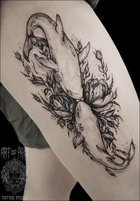 Татуировка женская графика на бедре рыбы 935