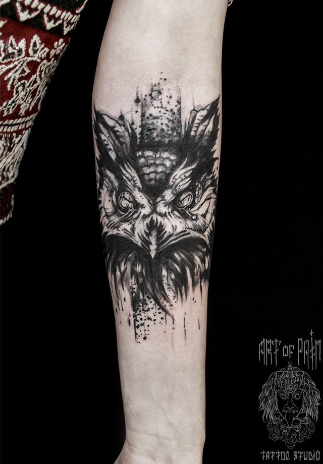 Татуировка женская графика на предплечье голова совы 942