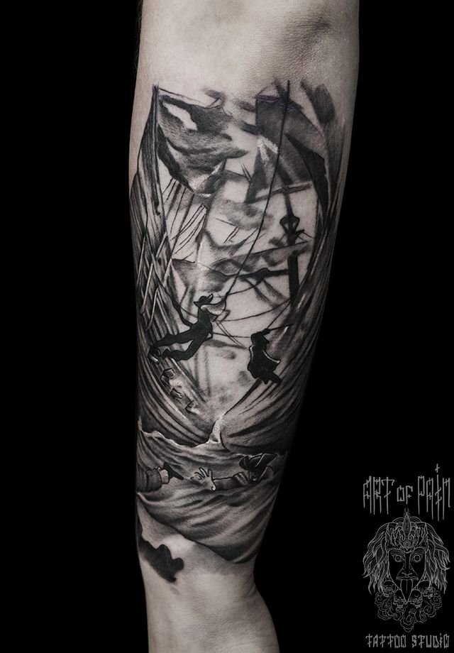 Татуировка мужская Black&Grey на предплечье тонущий корабль 1016