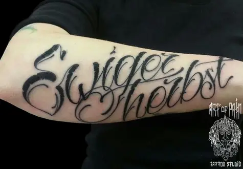 Татуировка мужская каллиграфия на предплечье надпись Ewiger Herbst 1147
