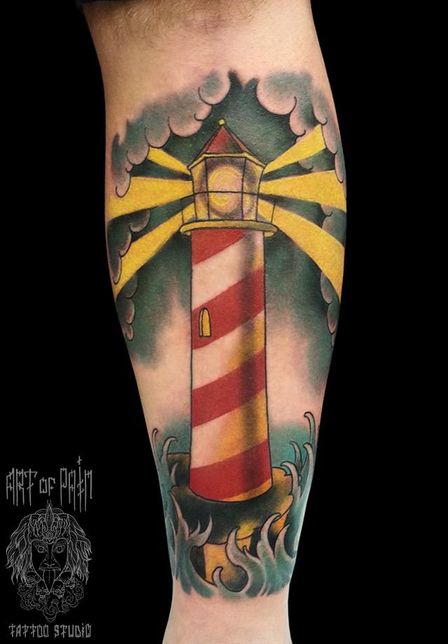 Татуировка мужская олд скул на икре маяк 1161