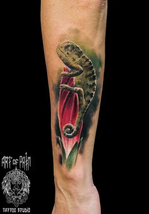 Татуировка мужская реализм на предплечье хамелеон на цветке 1185