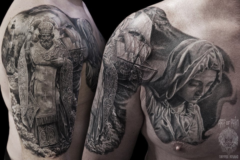 Татуировка мужская Black&Grey на плече: Митрополит и Дева Мария 1255