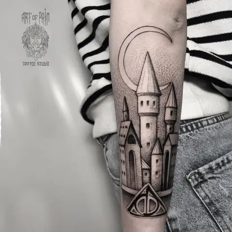 Татуировка мужская дотворк на предплечье дворец и полумесяц 1281