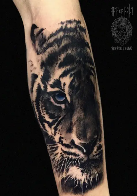 Татуировка мужская реализм на предплечье тигр с синими глазами 1372