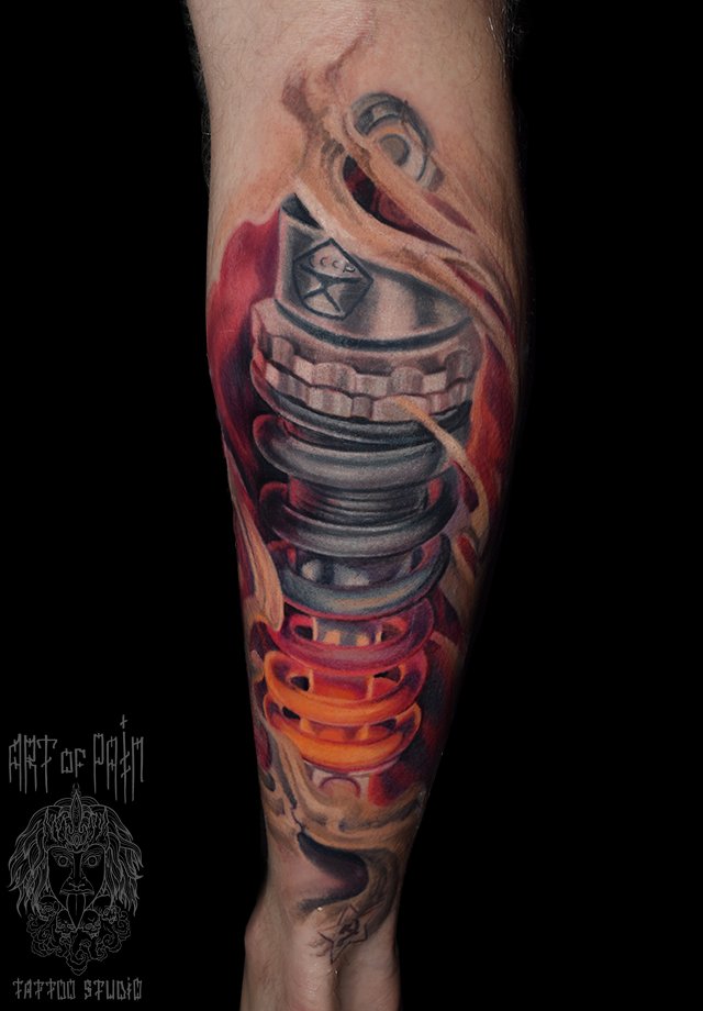 Татуировка мужская биомеханика на икре амортизатор 1419