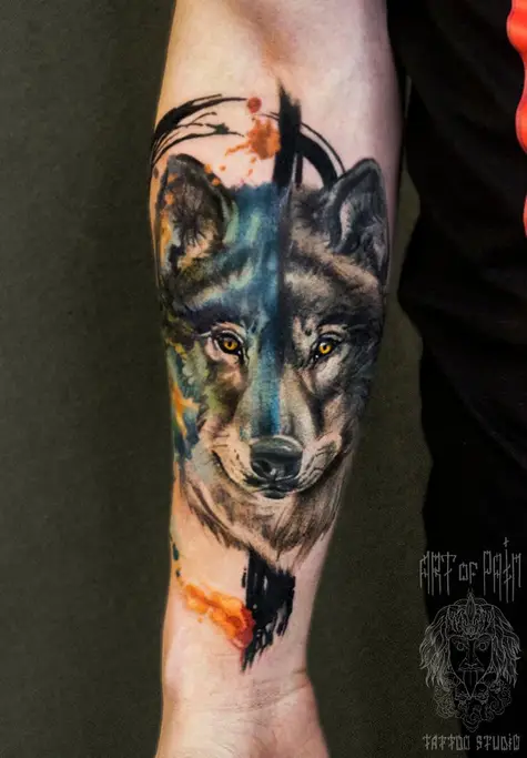 Татуировка мужская акварель на предплечье волк 1420