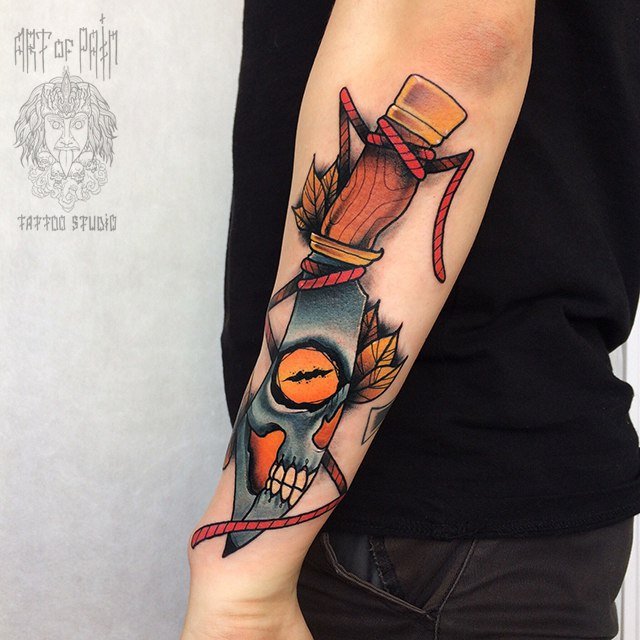 Татуировка мужская нью скул на предплечье нож и череп 1481