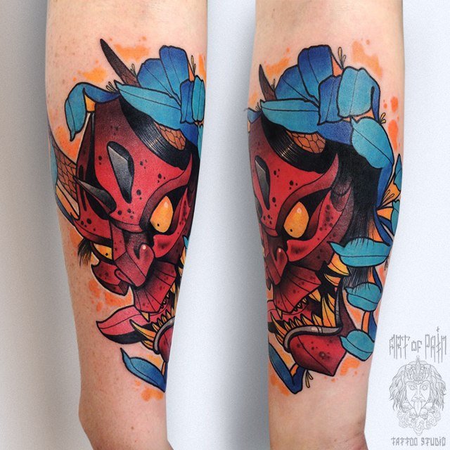 Татуировка мужская нью скул на предплечье Ханья и хризантема 1483