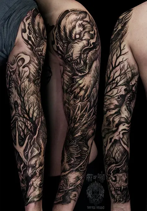 Татуировка мужская black&gray тату-рукав волк и вороны 1487