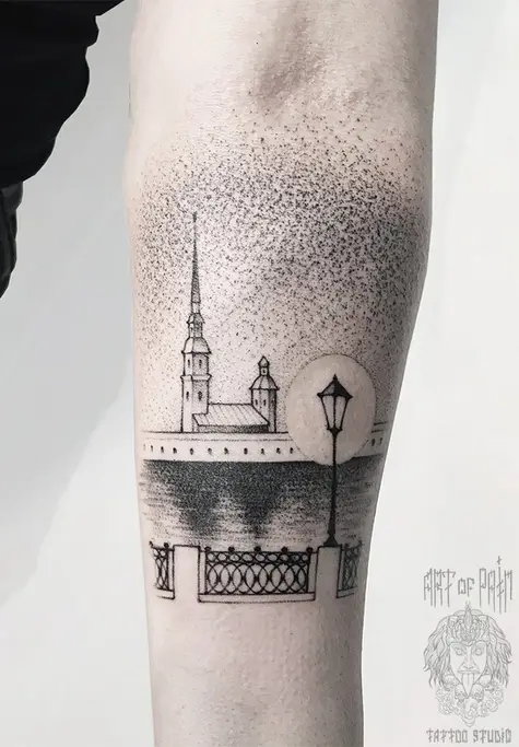 Татуировка мужская дотворк на предплечье Петропавловский собор 1536