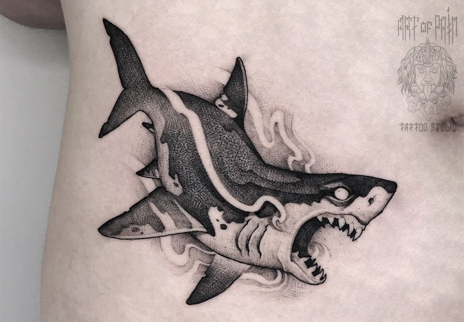 Татуировка мужская дотворк на животе акула 1540