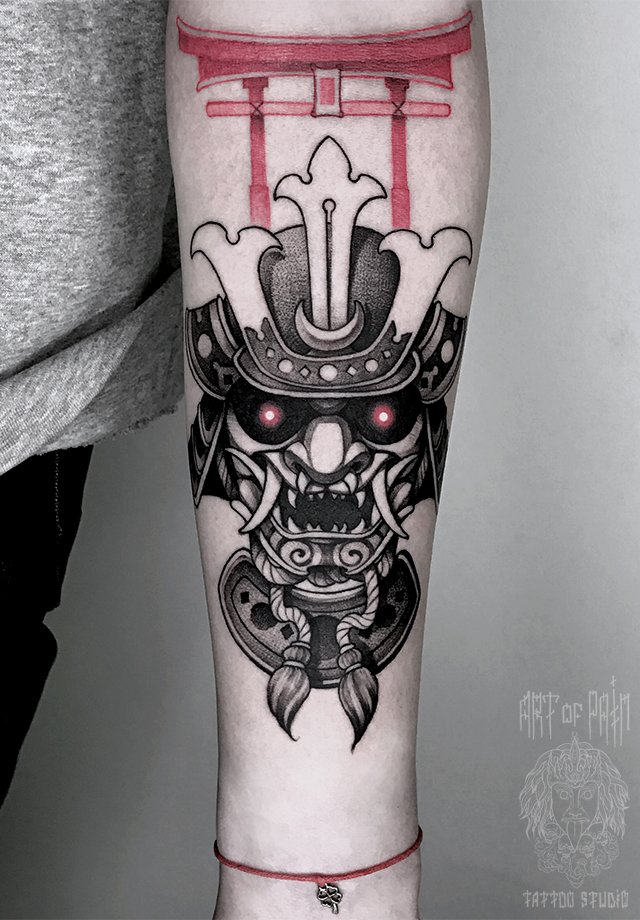 Татуировка мужская дотворк на предплечье японская театральная маска 1542