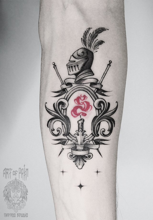 Татуировка мужская дотворк на предплечье рыцарь и свеча 1559