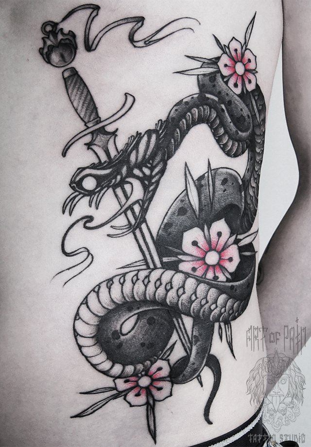 Татуировка мужская дотворк на животе змея и сакура 1563