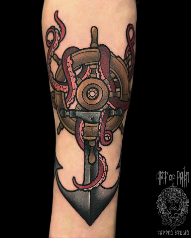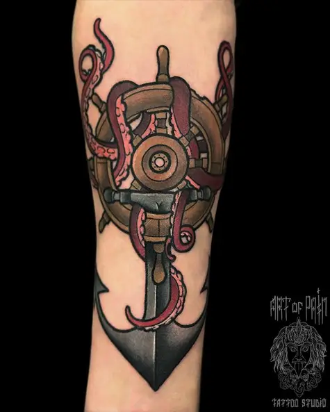 Татуировка мужская олд скул на предплечье якорь и штурвал 1565