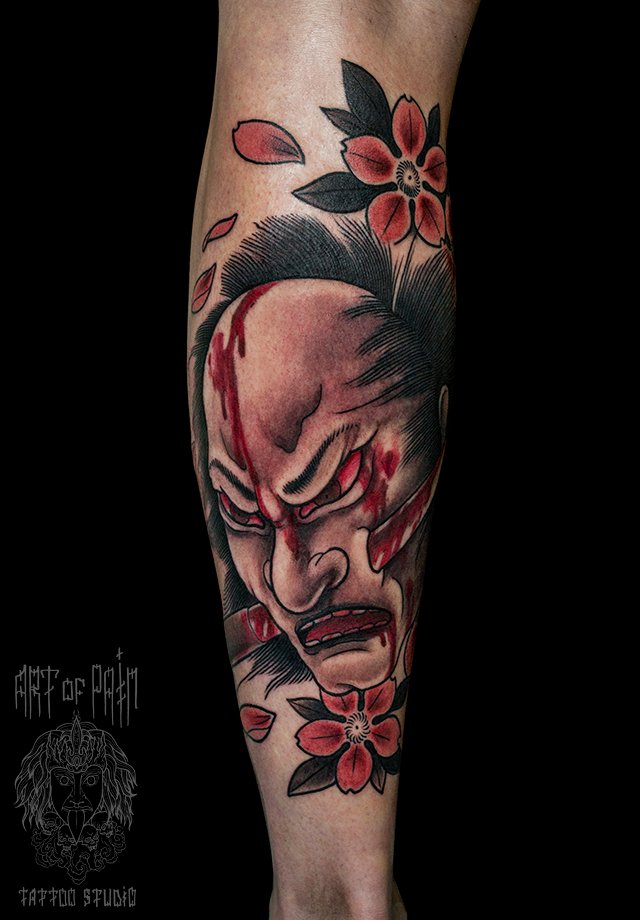 Татуировка мужская япония на голени мертвый самурай 1574