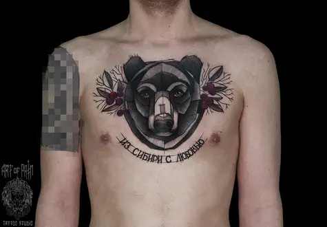 Татуировка мужская нью-скул на груди медведь 1585