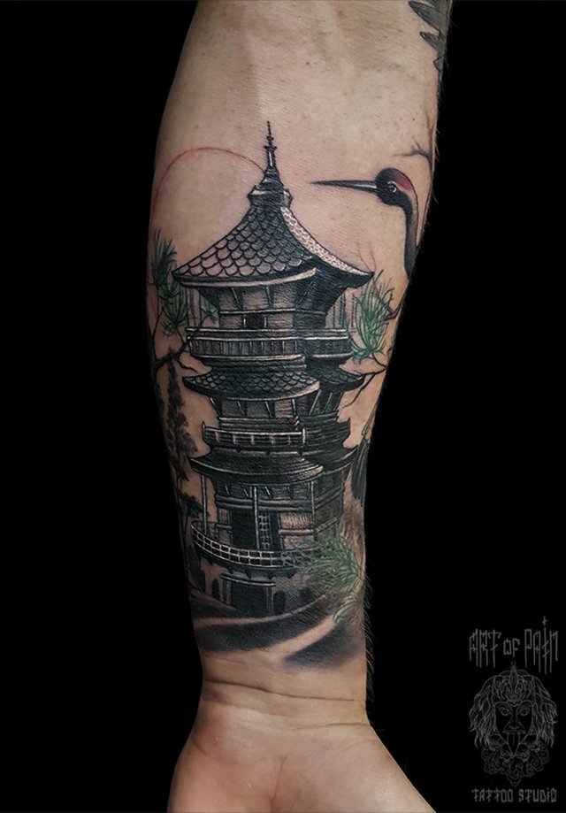 Татуировка мужская япония на предплечье пагода 1595